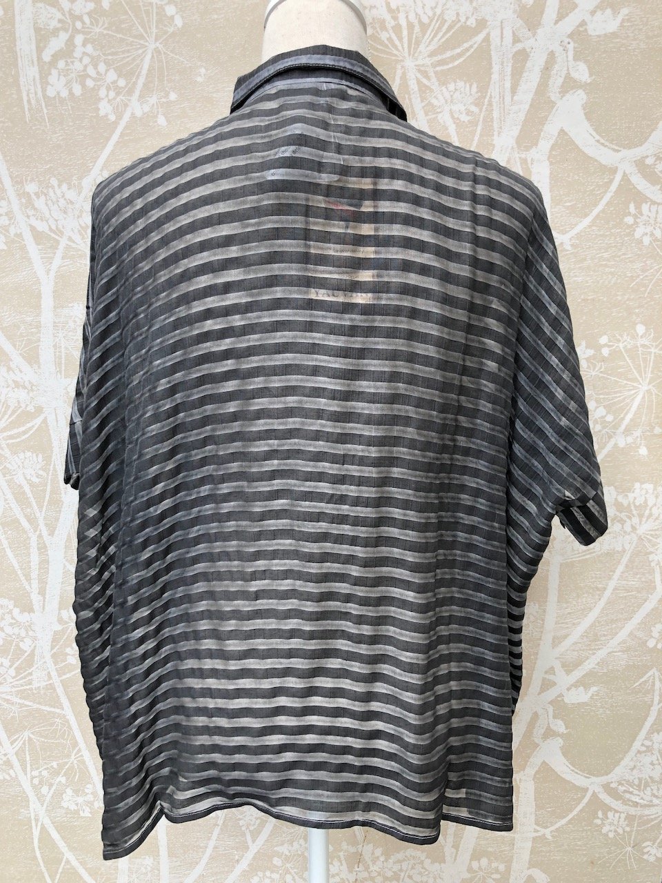 This blouse is a lovely wide and loose and cool shape with a collar finish at the neck. The sleeves come close to the elbow. The back is longer than the front.